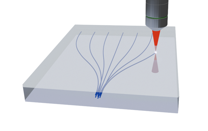 激光直寫3D波導技術利用自開發的飛秒激光直寫設備,通過精確控制激光在玻璃基材上的寫入,實現高精度的三維波導結構。該技術具有低損耗、高密度、精細加工的優勢,能夠在微米級別上精確調控光的傳播路徑,廣泛應用于光學通信、傳感器和光電集成等領域,推動光通信器件和模塊的創新與發展。